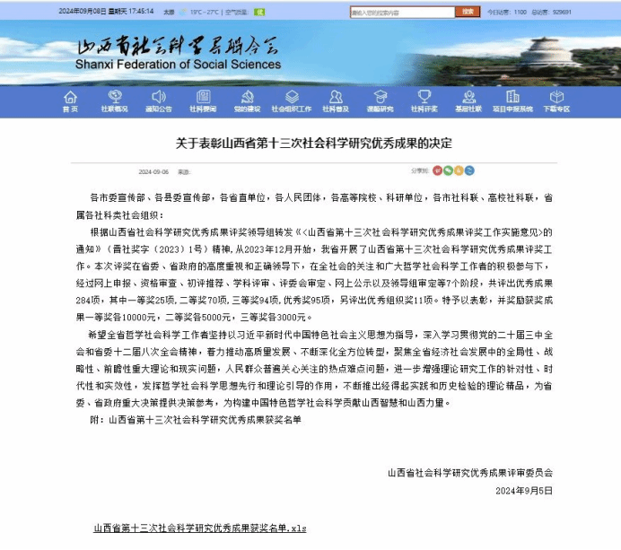 9月5日,山西省社会科学研究优秀成果评审委员会发布《关于表彰山西省第十三次社会科学研究优秀成果的决定》,永利yl23411集团法学系张振宇副教授的专著《专利权限制的国际比较研究》荣获山西省第十三次社会科学研究优秀成果奖(二等奖)。