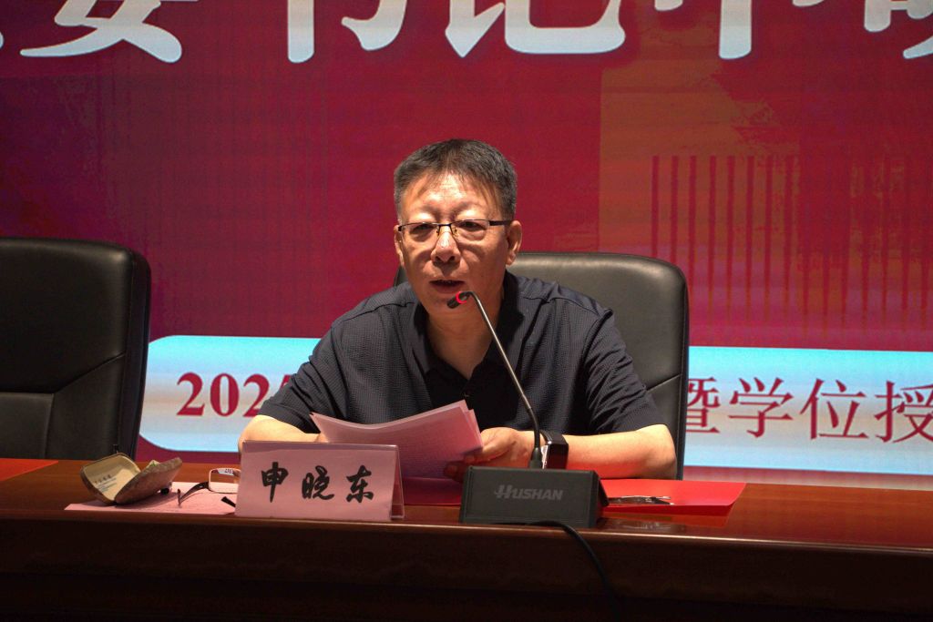 最后,院党委书记申晓东致辞,向毕业生们表示了热烈祝贺与殷切期望,他鼓励同学们要志存高远、砥砺奋进,秉持开放包容、守正创新的精神和乐观坚韧、不骄不馁的心态,将个人理想融入国家事业,以青春之笔书写无愧于祖国、无愧于人民、无愧于伟大时代的壮丽篇章。