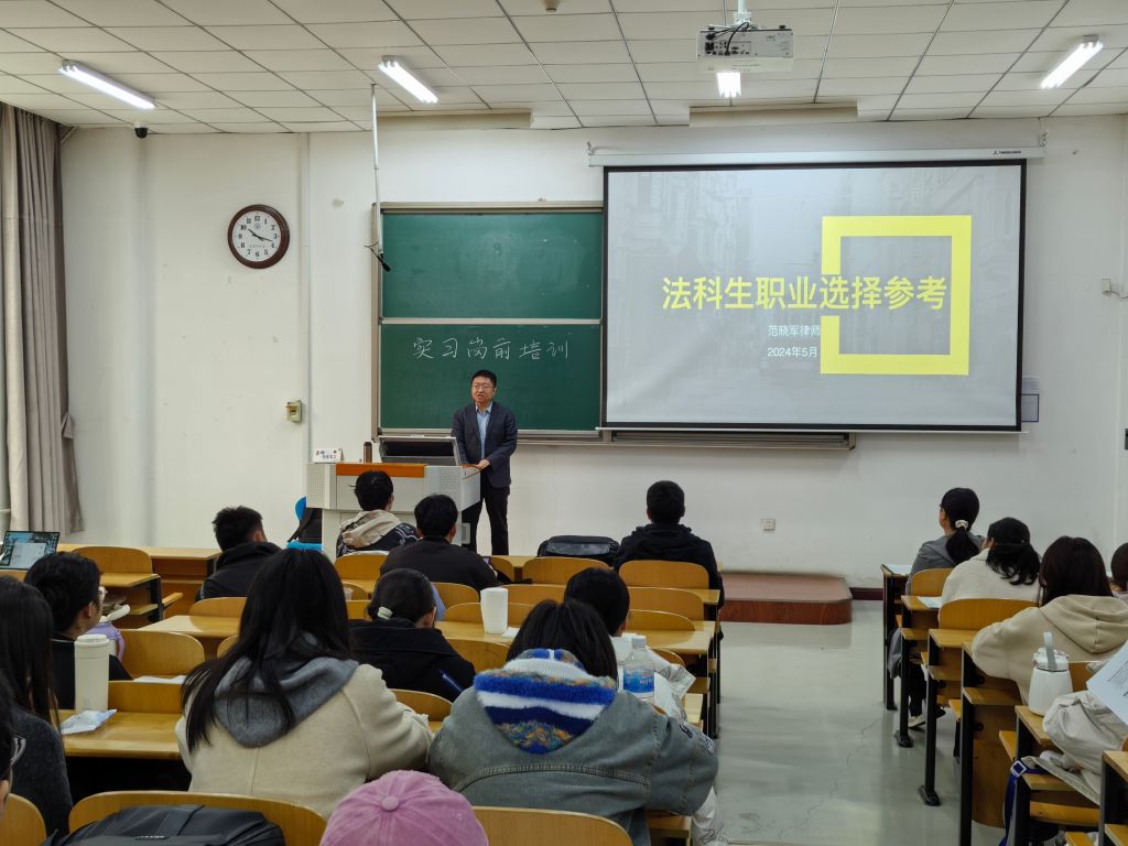 11月15日,山西晋商律师事务所合伙人范晓军律师受邀为永利yl23411集团法学专业学生作《法科生职业选择》专题讲座。法学专业100余名师生参加讲座,本次讲座也是一次法学2022级本科生参加实习活动前的一次岗前培训。法学系党支部书记、主任张振宇主持讲座。