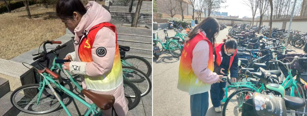 “雷锋精神的生命力在于实践,我们要把服务意识融入校园治理的毛细血管”。活动期间,党员志愿者们分赴东餐、西餐、北餐、图书馆等小绿车聚集区。他们身穿志愿马甲,对车胎气压、链条松紧、刹车灵敏度等多项指标进行检测排查,发现问题立即扫描车身二维码进入报修系统,同步上传定位照片,并将散放的单车停入规定停车区。“刹车失灵”“后轮辐条断裂”……一次次细致的检查、一句句精准的标注,是党员志愿者将雷锋精神内化于心,外化于行的生动注解,他们用每一次记录,谱写了雷锋日记的青春新篇。